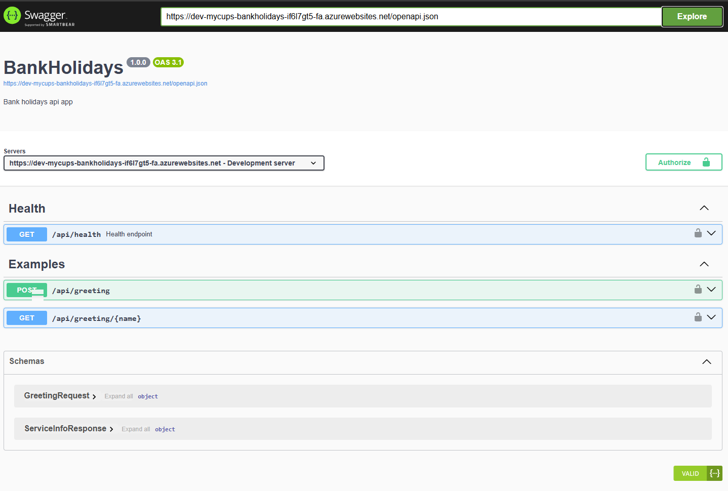 After deploying and smoke testing your service, you can also validate the OpenAPI definition using an external tool like Swagger UI.