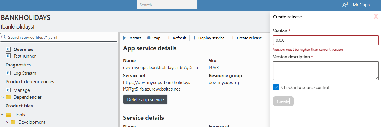 This is done from the Service Overview page by clicking the Create Release button: