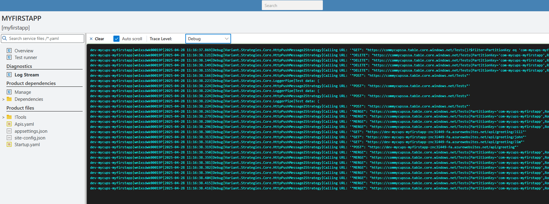 This page allows for the displaying and filtering of logs from your running service: