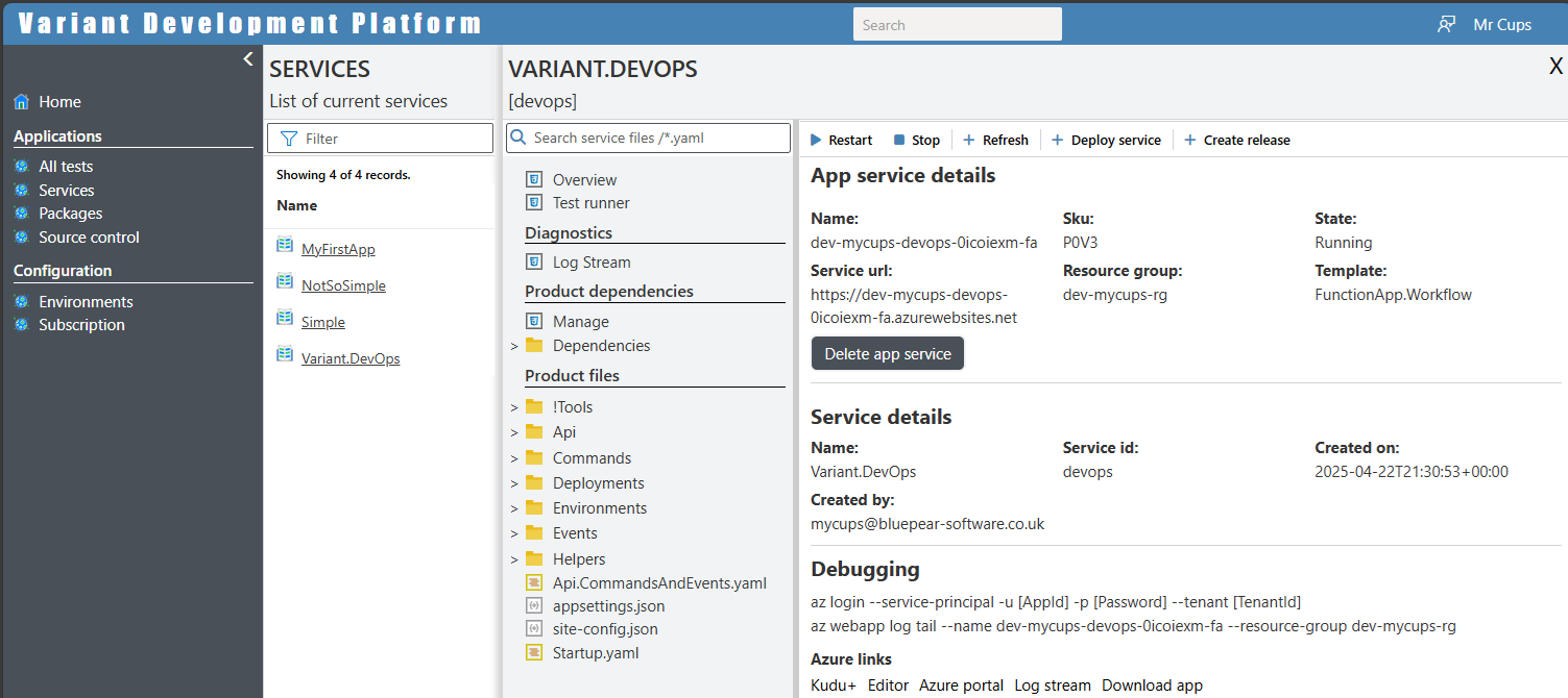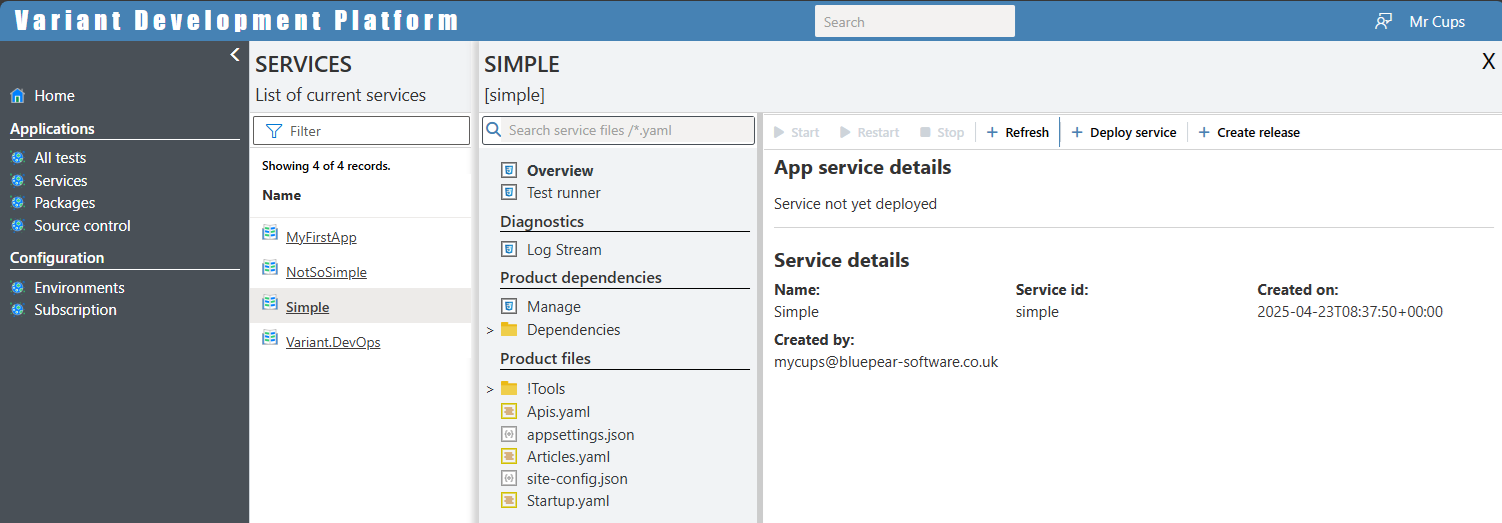 This page comes in 2 flavours: the first can be seen in the image sown in the previous section, which is displayed when you first create and service; and the seconds can be seen below where the actual service has been deployed. To deploy an application simply click on the deploy button found on this page.