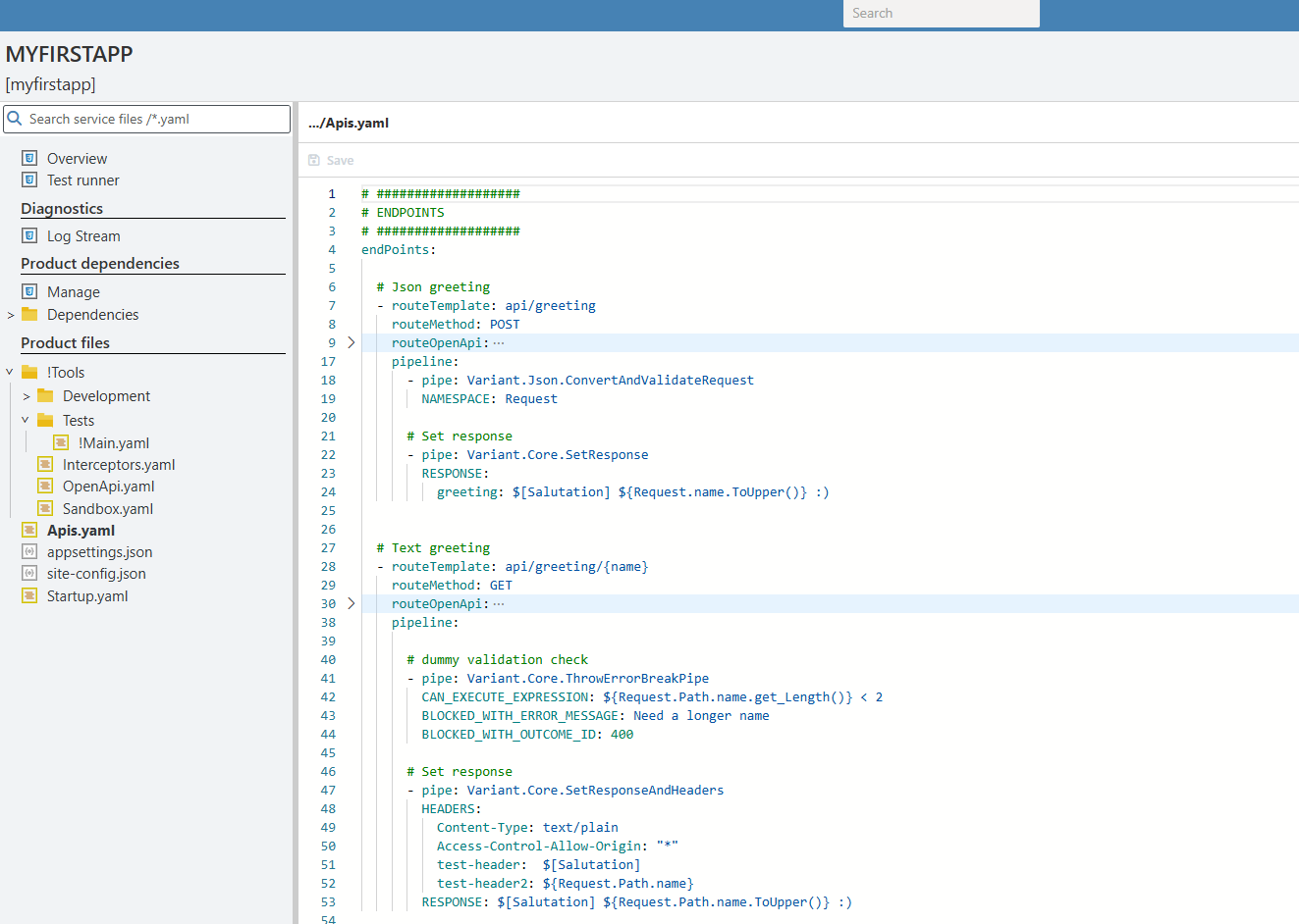 The editor in the right hand side allows for provides for shortcuts ('Ctrl+s' saves the file) and 'intellisense' capabilities. Examples of what is available are demonstrated in the 'Creating your first service' section