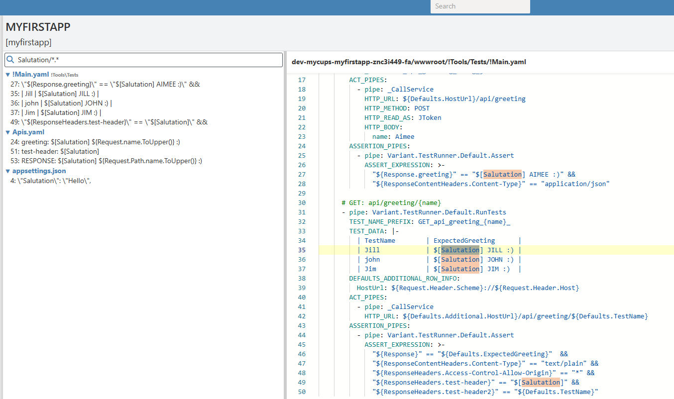 This allows you to search through through both your source code and the all dependencies source code for words and phrases:. The default behaviour is to just search YAML files, but just Json or all files can be searched through by adding the following text in the search bar: '/*.json' or '/*.*'. This can be seen in the following example where we are searching for the setting 'Salutation':