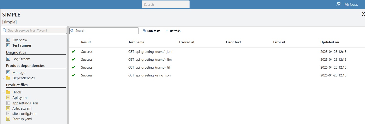 This is a simple page where you can start the applications tests and view the results. As the tests are run asynchronously you will need to refresh this page to get the results