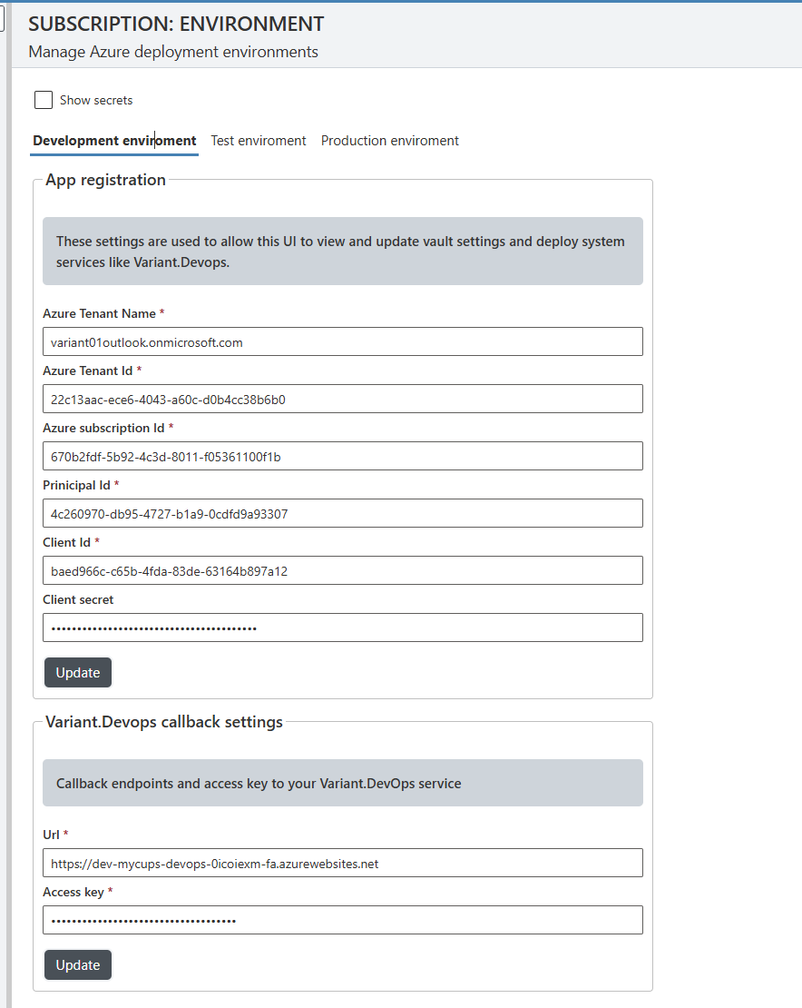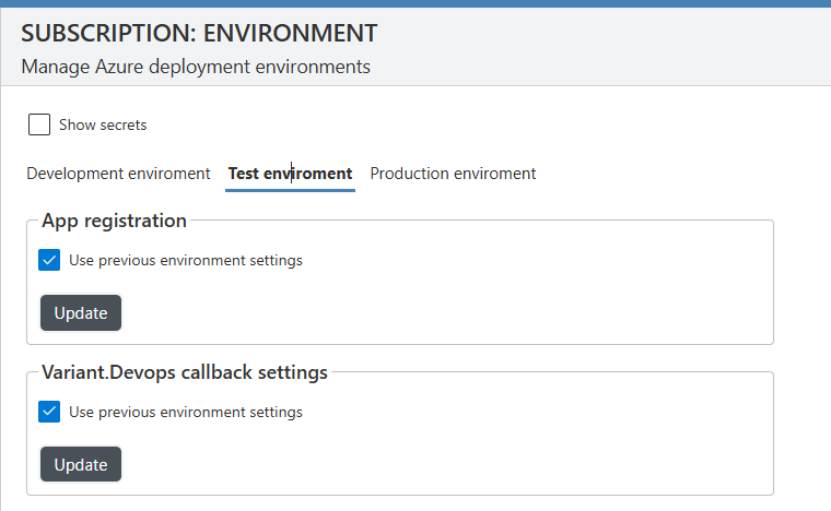 If you want to host an environment type (normally production) on a separate Azure subscription, uncheck the 'Use previous environment settings', create a new service principal on that subscription, click update and then follow the instructions.